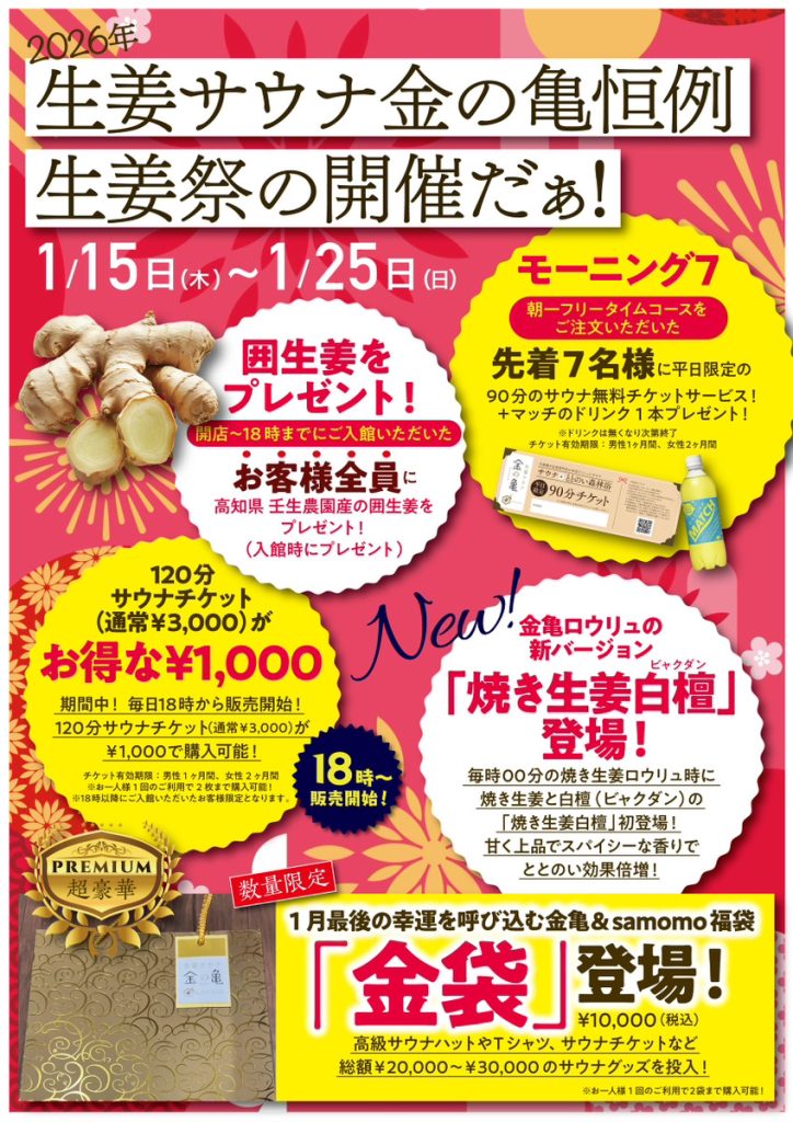 日頃より、生姜サウナ金の亀をご愛顧いただきまして誠にありがとうございます。