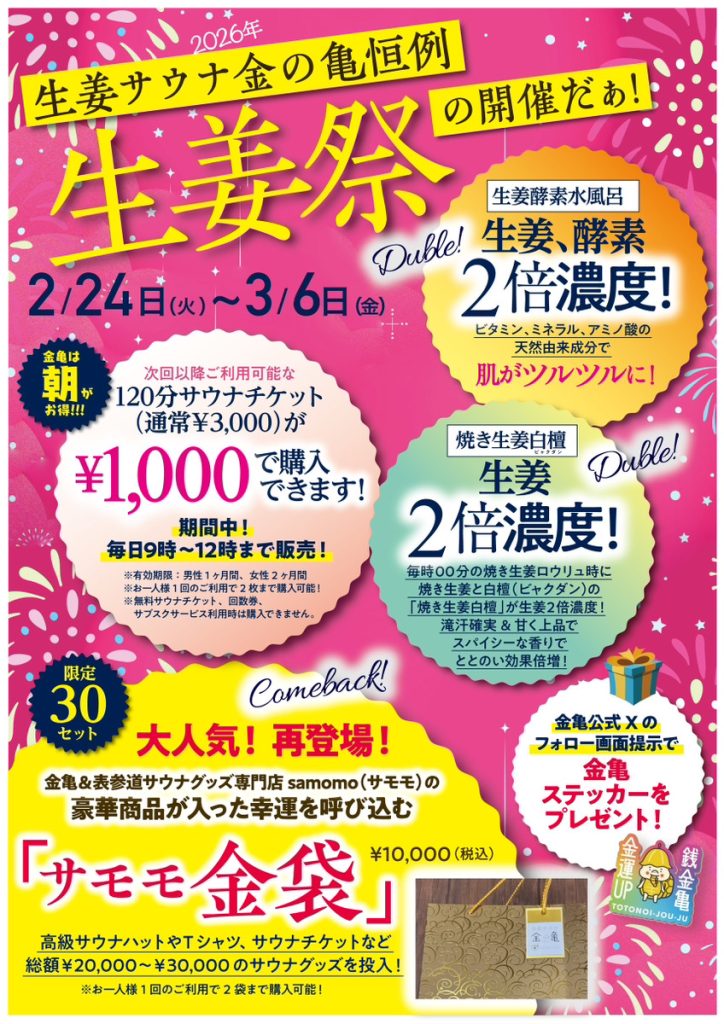 日頃より、生姜サウナ金の亀をご愛顧いただきまして誠にありがとうございます。