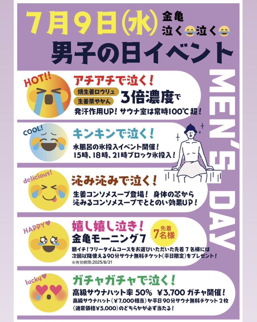 日頃より、ご愛顧いただきまして誠にありがとうございます。2025年7月9日(水)は、7(な)9(く)泣く男子の日イベントを開催いたします。終日男性専用のご利用となります。